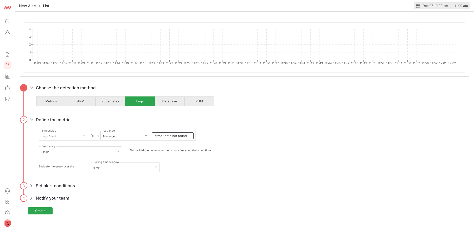 Go to Alerts -> Create new -> choose the detection method Logs