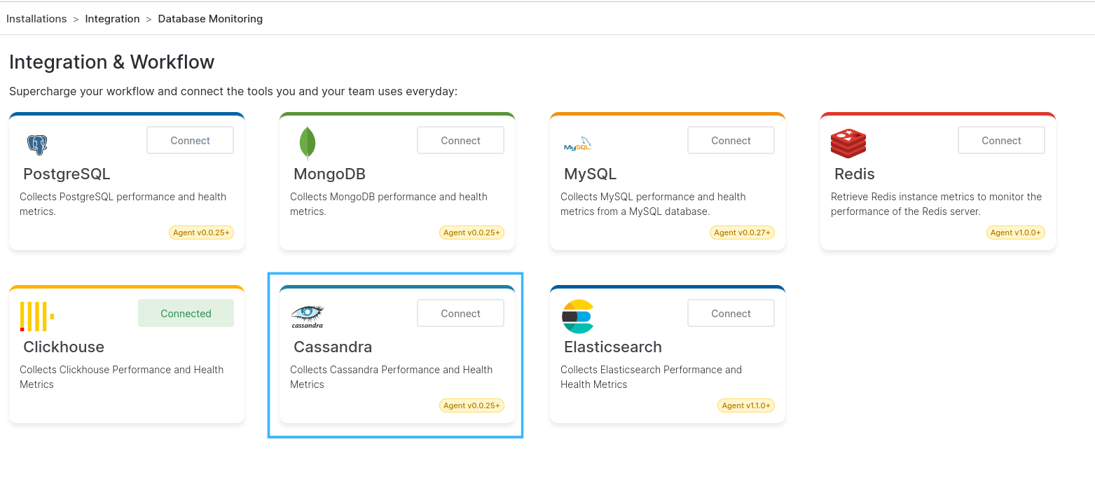 Login to your Middleware account, navigate to the Installations page in the bottom left corner, select All Integrations and click Cassandra:
