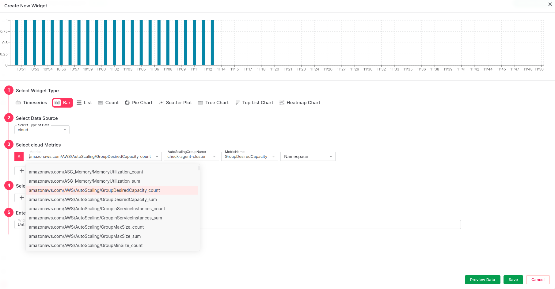 You can create a dashboard from scratch by yourself. If you add a new widget to any existing dashboard, you will be able to see list of available AWS metrics under the “cloud” Data source. You can visualize in many different Widget types i.e. Timeseries, Bar Chart, Pie Chart, etc.