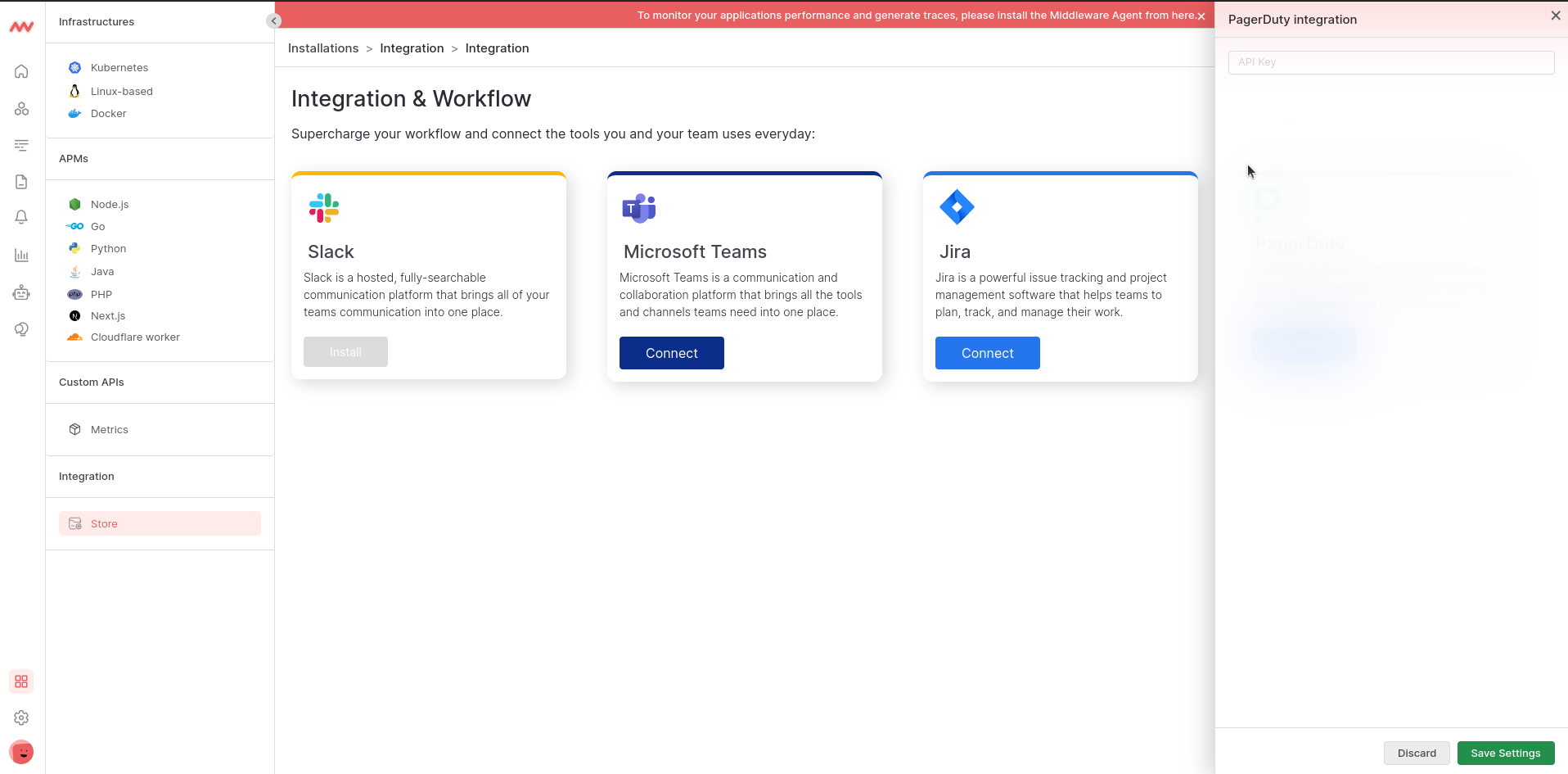 Follow these steps to set up PagerDuty integration with Middleware account.- Login to the Middleware account and navigate to the PagerDuty integration under the installation section. Login -> Installations -> Store in that there will be PagerDuty