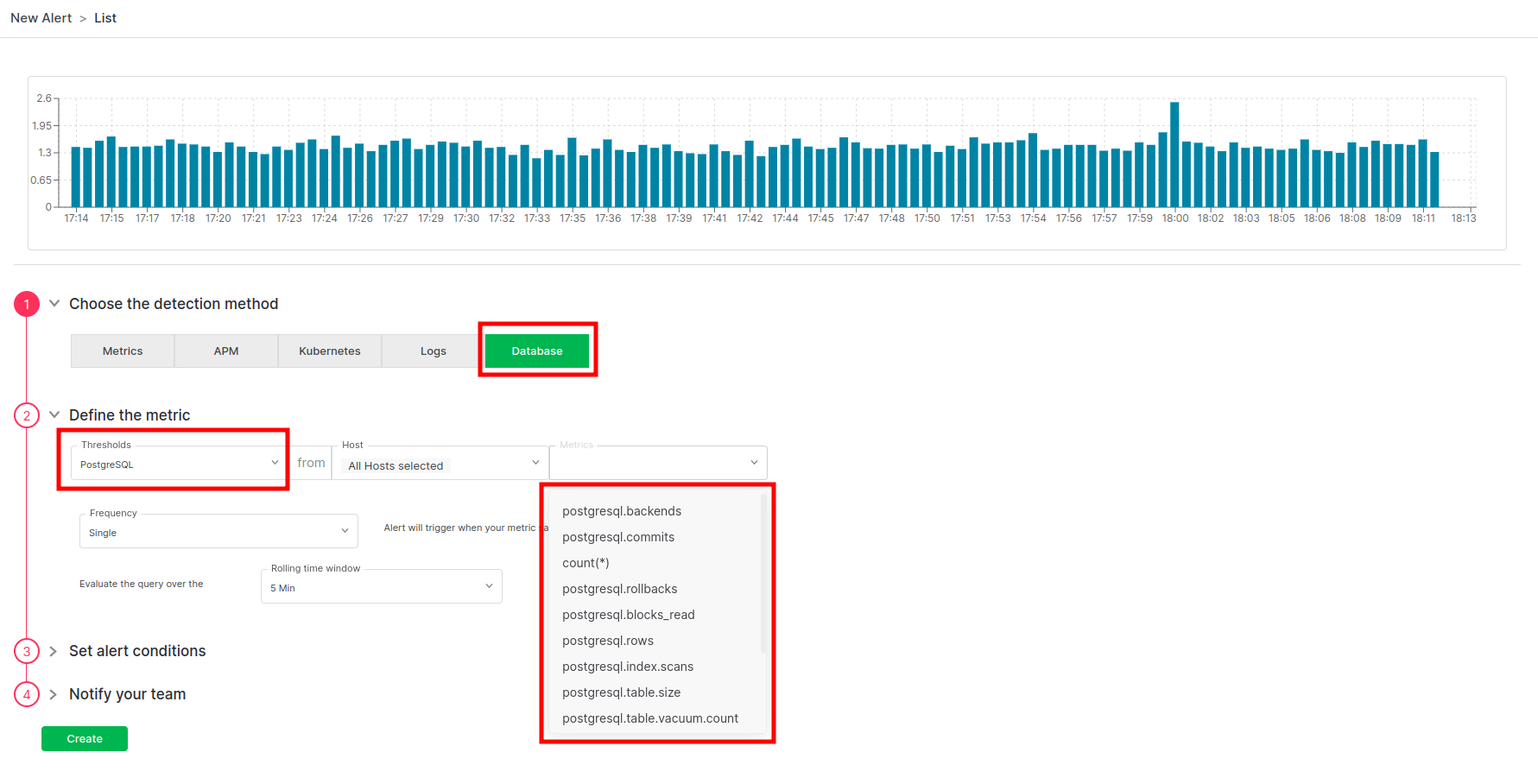 Alerts can be configured for any PostgreSQL metrics. When creating a new rule select the Database detection method and PostgreSQL database type for available metrics to appear in the Metrics dropdown list. Select the desired metric and continue configuring the alert conditions.