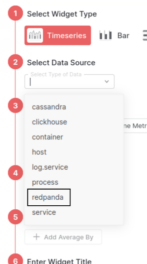 Create your own widget from scratch. Navigate to the Dashboard Builder and select the dashboard you would like to create a widget in. Select Add New Widget and choose theredpanda data source.