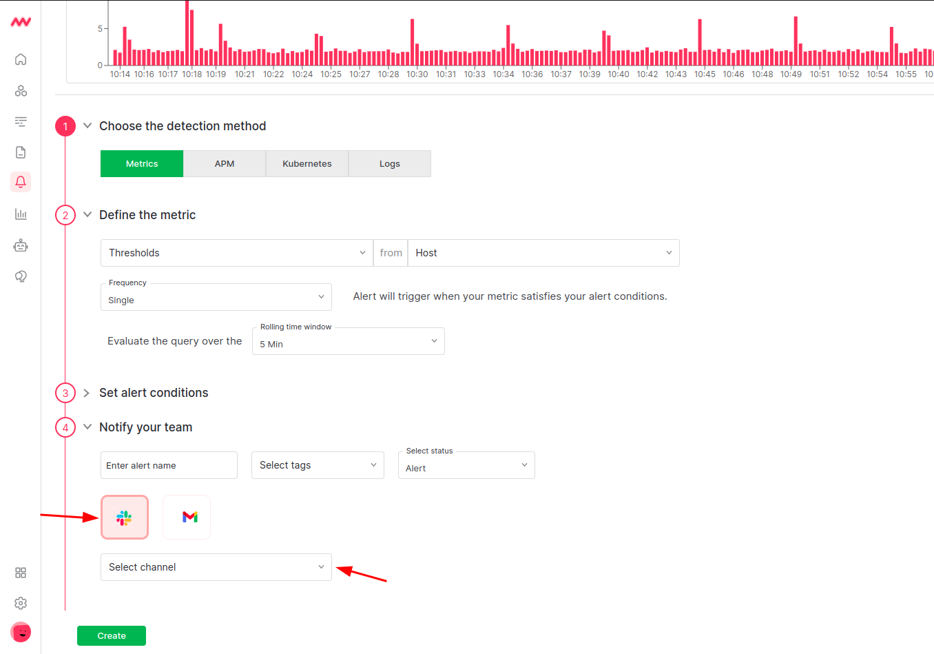 After integrating Slack, proceed with the following steps to configure alert notifications in Slack.- Navigate to alerts from the left menu.